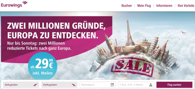 Mit Eurowings geht es aktuell unter dem Motto „2 Millionen Gründe, Europa zu entdecken“ für gerade mal 19,99€ pro Person in viele europäische Destinationen (oneway). Aber aufgepasst: Dieser mega Deal ist nur bis Sonntag, 14.03. bis 23:59 buchbar – also nichts wie zuschlagen!