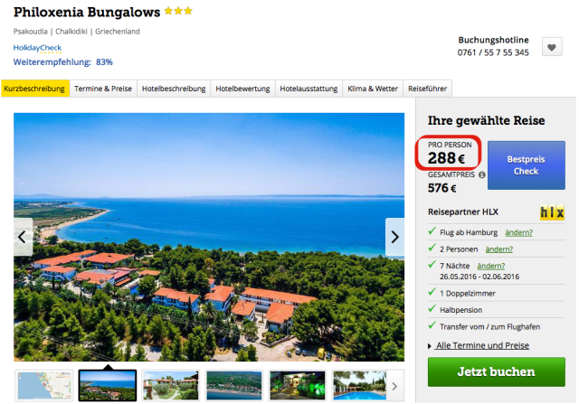 Ich war zwar noch nie auf der schönen griechischen Insel, aber genauso stelle ich mir einen Urlaub auf Chalkidiki vor: Pinien, Meer und eine gepflegte Hotelanlage am schönen Strand. Der Preis ist aber geradezu unvorstellbar günstig: Für nur 288€ pro Person könnt ihr es euch dort für eine Woche gut gehen lassen. Flug und Halbpension snd schon inklusive! Worauf wartet ihr noch? 🙂