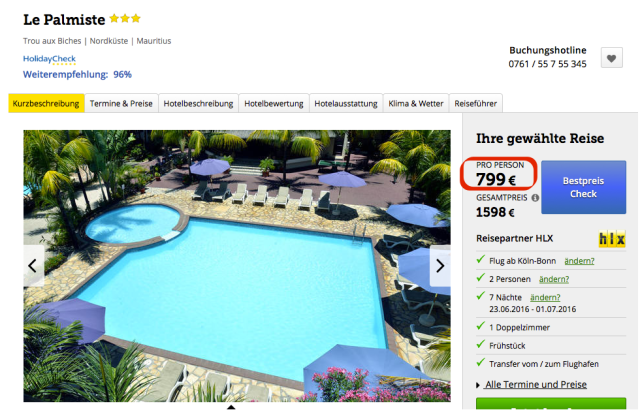 Der Strand von Trou aux Biches ist über vier Kilometer lang und gehört zu den schönsten und bekanntesten Stränden der Insel Mauritius. Wie passend, dass HLX für euch dort ein besonders tolles Angebot hat: 1 Woche im schönen 3-Sterne-Hotel inkl. Flug für 799€ pro Person. Bei anderen Anbietern kostet die Reise deutlich mehr, der Aktionspreis ist wirklich gut!