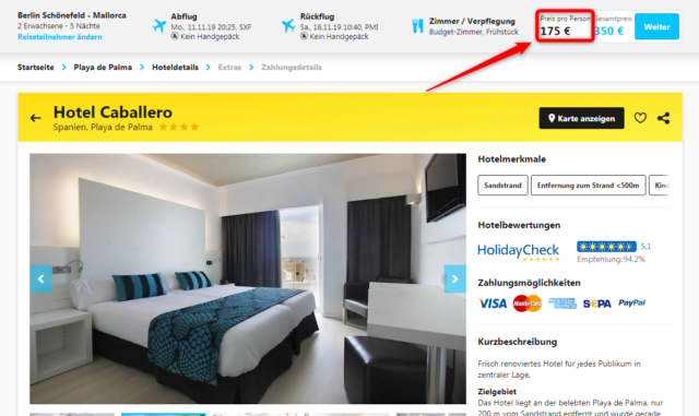 Am günstigsten reist ihr Mitte November 2019 nach Mallorca, jedoch sind noch zahlreiche Alternativtermine für einen nur geringen Aufpreis verfügbar. Wer denkt im November ist es eisig an der Playa de Palma der täuscht sich: Hier herrschen immer noch Temperaturen bis zu 19°C. Los geht’s ab dem Airport Berlin-Schönefeld; Dortmund, Düsseldorf, Münster und Stuttgart sind ähnlich günstig.Â