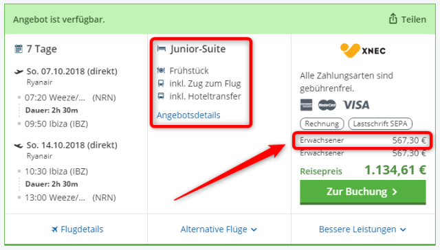 Das schöne Ibiza Angebot ist am günstigsten für Anfang bis Mitte Oktober 2018 zu haben, also perfekt um dem deutschen Herbstwetter zu entfliehen. Es sind noch viele Alternativtermine für einen geringen Aufpreis buchbar. Es stehen viele Abflughäfen, wie z.B. Weeze, München und Köln/Bonn, zur Verfügung. Da der Zug-zum-Flug inkludiert ist, könnt ihr von einem Wunschbahnhof in eurer Nähe zum Abflughafen fahren. Auch der Transfer (Flughafen-Hotel-Flughafen) ist mit drin!