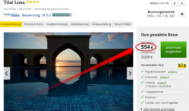 Nirgends sollen der Himmel klarer und mehr Sterne zu sehen sein, als in der Arabischen Wüste. Davon könnt ihr euch jetzt selbst überzeugen! Ihr habt die Möglichkeit für 554€ in die Wüste Abi Dhabis zu reisen und dort in einem super 4-Sterne Hotel einen einmaligen Urlaub zu verbringen. Flug und Transfer sind schon mit dabei. Entspannt am Hotelpool, bucht eine Quad-Tour durch die Wüste oder macht einen Ausflug nach Dubai. Hier wird der Traum von 1001 Nacht zur Wirklichkeit!